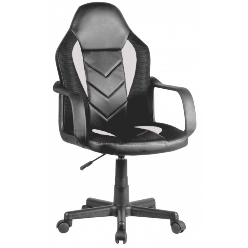 tapicerowany imitacją skóry oraz tkaniną membranową, regulacja wysokości siedziska, plastikowe podłokietniki i podstawa, kółka do powierzchni miękkich,D57*W54*H92-104CM