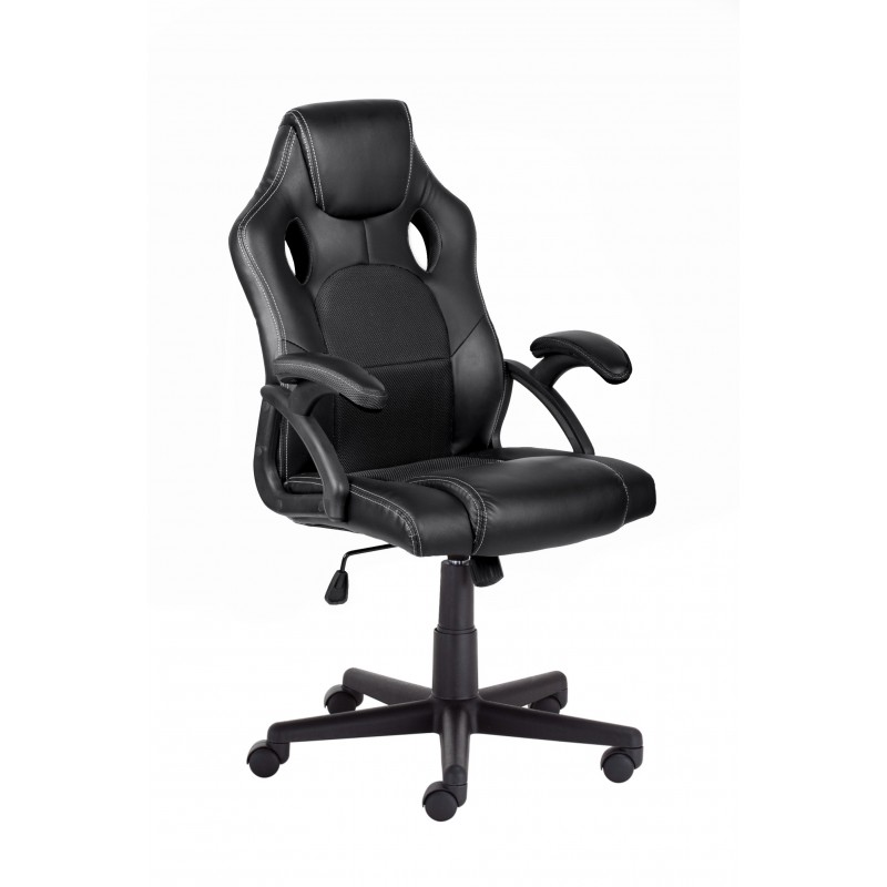 tapicerowany imitacją skóry oraz w środkowej części tkaniną membranową 3D, podłokietniki z tworzywa z miekkimi, tapicerowanymi nakładkami, podstawa nylonowa, mechanizm kołysania się TILT pozwalający na swobodne kołysanie się, blokadę w pozycji do pisania, regulację siły wychylenia oparcia, kółka do powierzchni twardych z oponkami WYMIARY: Wysokość 104-115cm
