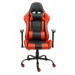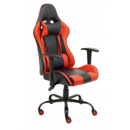 duży fotel gamingowy, kubełkowy kształt oparcia i siedziska, tapicerowany ekoskórą, wyposażony w mechanizm kołysania się 2-dźwigniowy pozwalający na blokadę fotela w pozycji do pracy i wychelenie do 150 stopni, regulowane podłokientiki góra-dół z miękkimi nakladkami, posiada regulowane poduszki podpierające lędźwie i szyję, kółka z oponką do twardych powierzchni nie rysujące podłogi, podłokietniki z tapicerowanymi nakładkami, podstawa metalowa w kolorze czarnym,W68*D63*H125-135CM