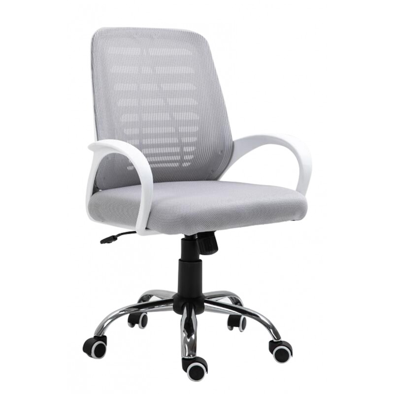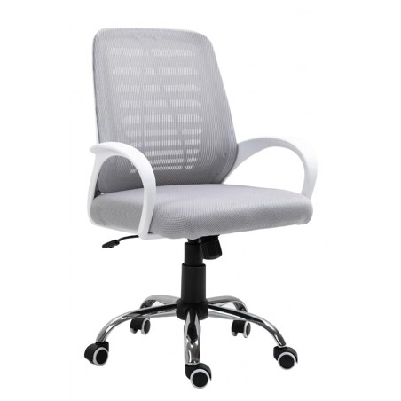 oparcie tapicerowane wentylowaną siatką, dopasowującą się do pleców użytkownika, siedzisko tapicerowane tkaniną 3D MESH, stelaż plastikowy w kolorze białym, podstawa metalowa, chromowana, kółka do powierzchni twardych nierysujące podłogi, regulacja wysokości siedziska,53*54*(81-89)cm