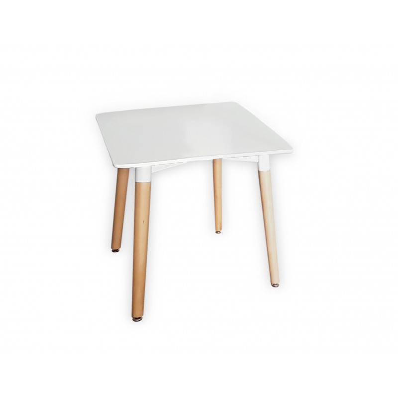 blat z płyty MDF w kolorze białym, nogi wykonane z drewna bukowego, wymiary 80x80x73 cm