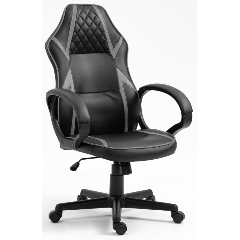 tapicerowany imitacją skóry, podłokietniki z tworzywa z miękkimi, tapicerowanymi nakładkami, podstawa nylonowa, mechanizm kołysania się TILT pozwalający na blokadę w pozycji do pisania, regulację siły wychylenia oparcia, kółka do powierzchni miękkich
