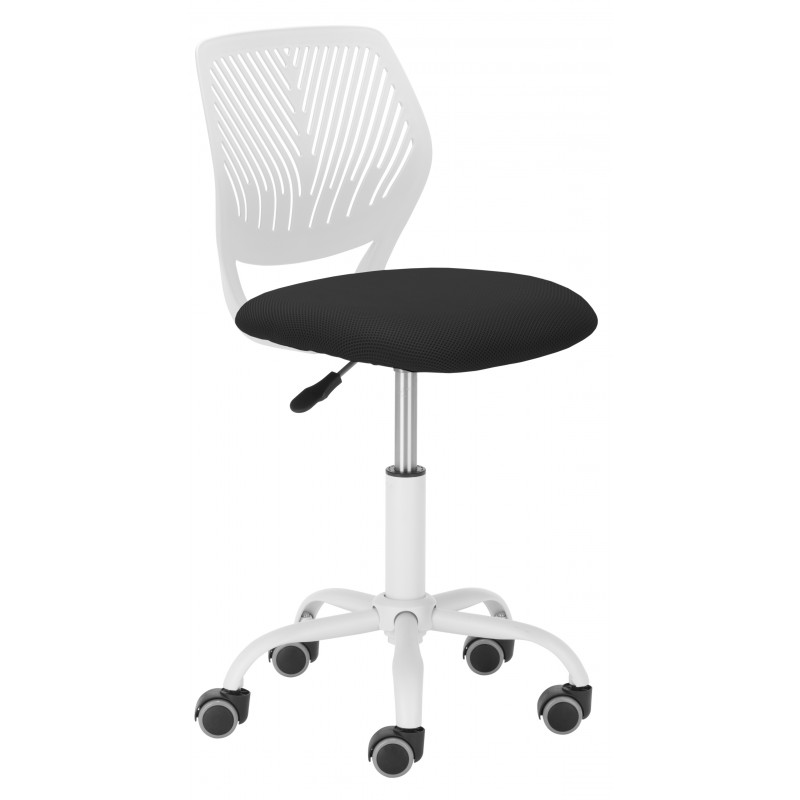 oparcie z tworzywa, siedzisko tapicerowane tkaniną, podstawa metalowa lakierowana na kolor biały, regulacja wysokości siedziska, kółka do powierzchni twardych