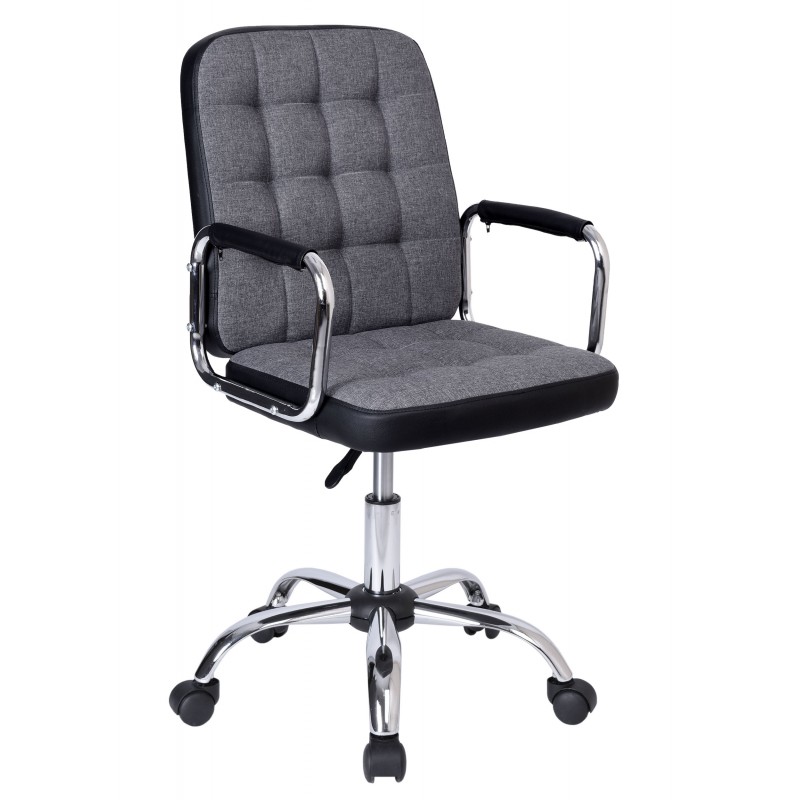 tapicerowany tkaniną, regulacja wysokości siedziska za pomocą podnośnika pneumatycznego, podstawa metalowa, z kółkami do powierzchni miękkich,